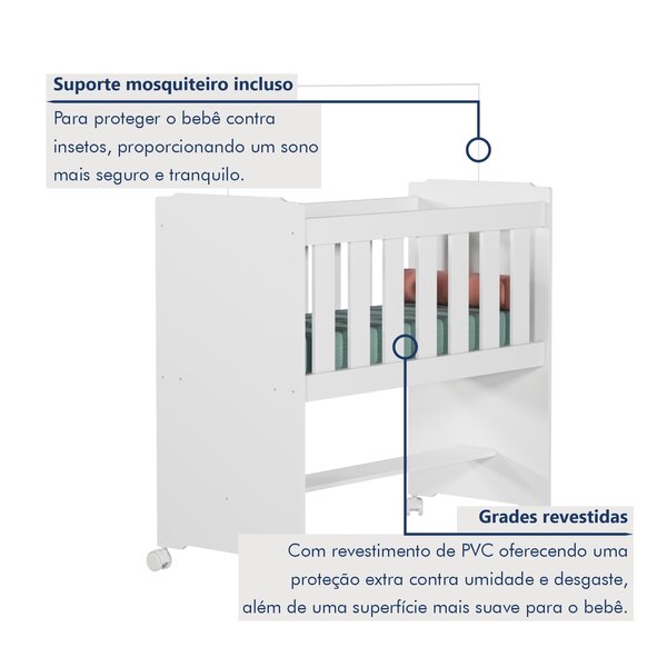 Mini berço 100% mdf com rodízios . O mini berço 100% mdf com rodízios oferece conforto e praticidade para o quarto do bebê. Com design seguro e funcional, ele conta com rodízios para facilitar o movimento, permitindo que você desloque o berço com facilidade. A estrutura em mdf oferece durabilidade e resistência, enquanto o colchão incluso garante o conforto necessário para uma boa noite de sono. O berço é fácil de movimentar? Sim, os rodízios facilitam o deslocamento do berço pelo ambiente.