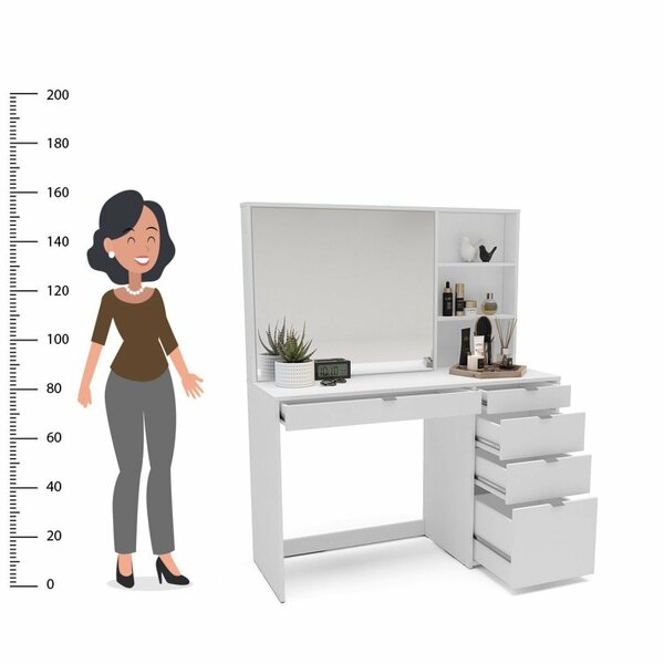 além das gavetas, a penteadeira conta com 3 nichos adicionais, ideais para armazenar outros objetos de decoração ou itens que você deseja manter à mão. O amplo espelho integrado proporciona uma visão clara e completa do rosto, tornando a aplicação de maquiagem mais precisa e facilitando o processo de arrumação do cabelo.