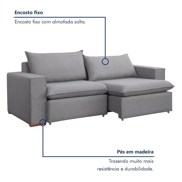 Sofá retrátil 200cm barcelona linho/cinza. Se você está em busca de um sofá retrátil que te abraça de tão confortável, achou o modelo certo! Nosso sofá com almofadas inclusas é ideal para garantir aquele clima gostoso de descanso, seja assistindo à sua série favorita, tirando uma soneca ou até receber os amigos com estilo. O sofá tipo retrátil tem a estrutura resistente feita em madeira reflorestada, enquanto o encosto com enchimento fibra siliconada e o assento estofado em espuma dá o toque perfeito que transformará sua sala no seu novo cantinho favorito. E sabe o que é melhor? Além de lindo, ele é super prático e fácil de ajustar.